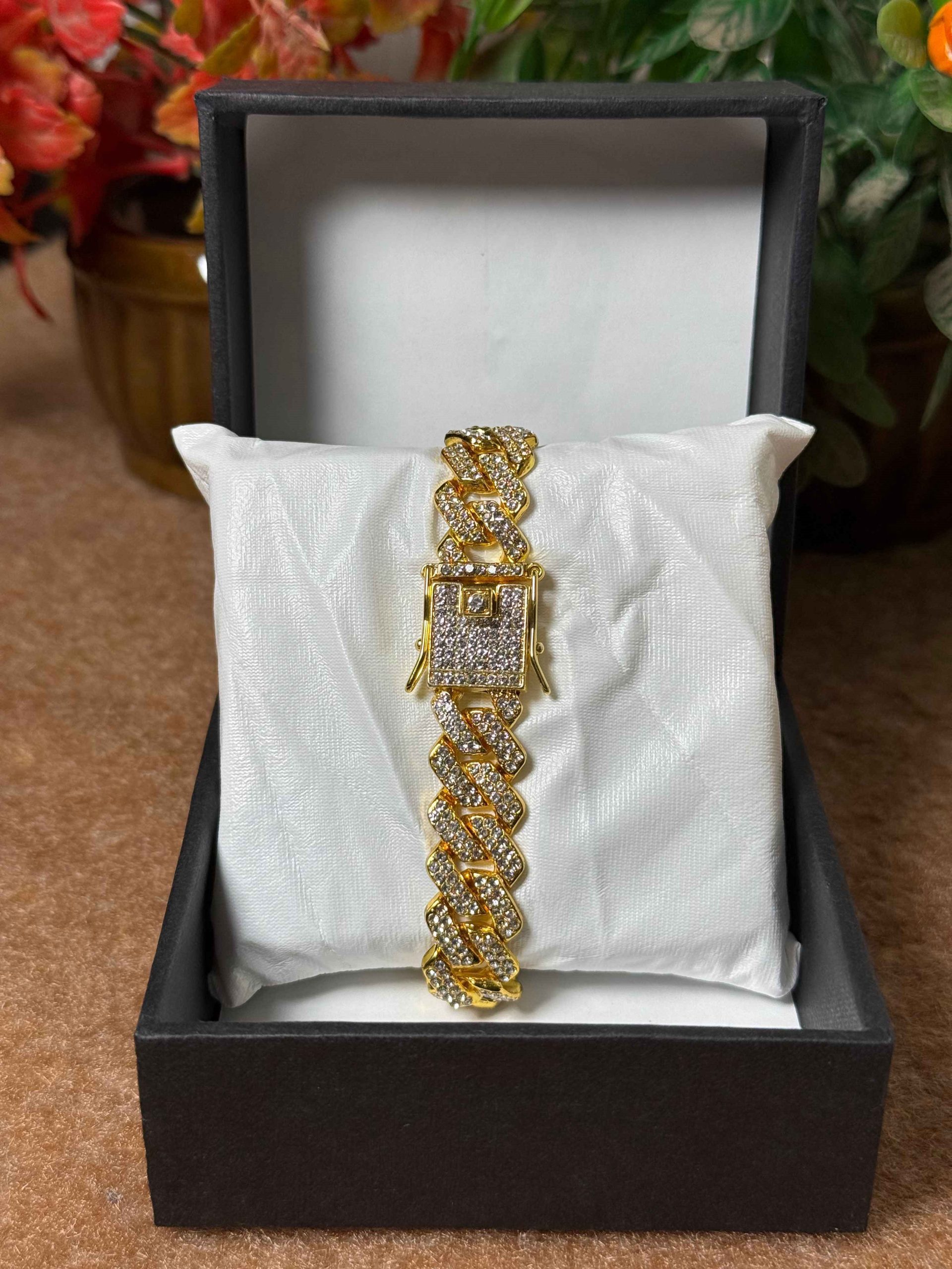 Apne style ko upgrade karein is Premium Iced Out Cuban Link Bracelet ke sath. Ye bracelet khususi taur par un logon ke liye design kiya gaya hai jo luxury aur bold fashion pasand karte hain. Iska har link bariki se tarasha gaya hai aur chamakdar stones se bhara hua hai jo har angle se roshni ko reflect karte hain.